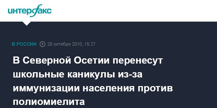 Владикавказ. 26 октября. INTERFAX.RU - Власти Северной Осетии приняли решение перенести начало осенних школьных каникул с 1 на 4 ноября для проведения иммунизации от полиомиелита, сообщил на заседании правительственной комиссии зампред правительства Северной Осетии Сергей Таболов.