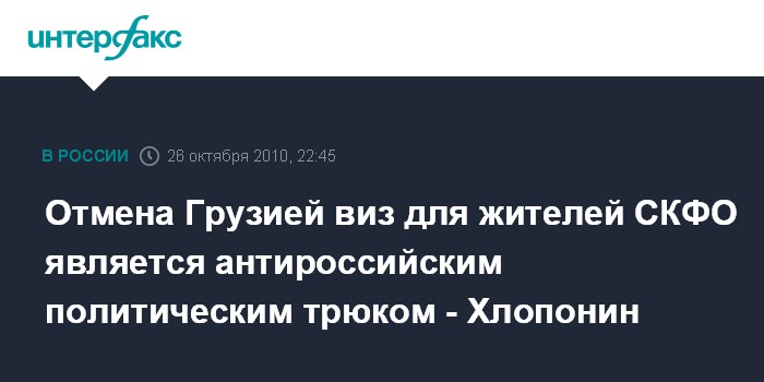 "Думаю, это (отмена визового режима - ИФ) не от большого ума, и не надо обращать на это внимания. Но когда начинаешь переосмысливать это с точки зрения общей стратегии конфронтации на Кавказе, понимаешь, как все это точно вписывается в идеологическую концепцию разрушения общекавказской стабильности, которую мы стараемся поддерживать и в России, и за ее пределами", - заявил А.Хлопонин в ходе прямой линии во вторник.
