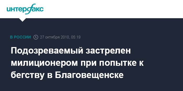 Благовещенск. 27 октября. ИНТЕРФАКС-ДАЛЬНИЙ ВОСТОК - Сотрудник милиции во вторник в Благовещенске застрелил из табельного оружия подозреваемого в краже, который пытался бежать.