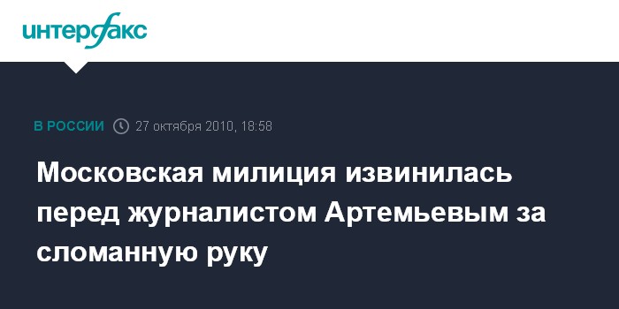 Москва. 27 октября. INTERFAX.RU - ГУВД Москвы принесло извинения журналисту сетевого издания "Газета.ру" Александру Артемьеву, которому сломали руку после разгона милицией акции на Триумфальной площади столицы 31 мая.