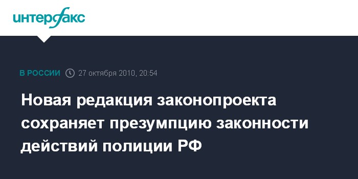 Москва. 27 октября. INTERFAX.RU - Презумпция законности сотрудников органов внутренних дел сохранена в новой редакции законопроекта "О полиции", внесенного президентом РФ Дмитрием Медведевым в Госдуму в среду.