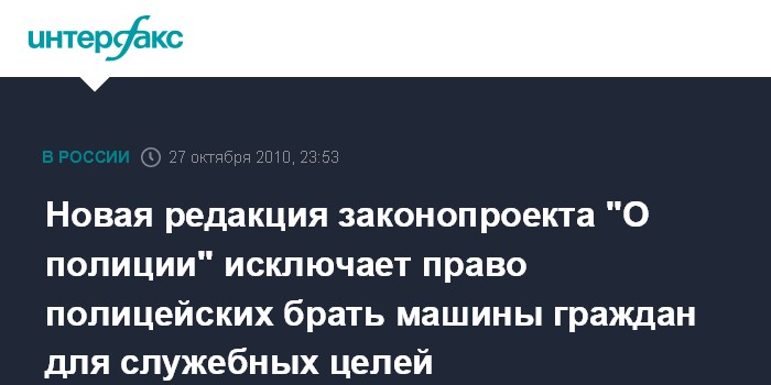 Москва. 27 октября. ИНТЕРФАКС - Новая редакция проекта закона "О полиции" исключает право полицейских принимать от граждан и организаций во владение автотранспорт и имущество для выполнения служебных задач.