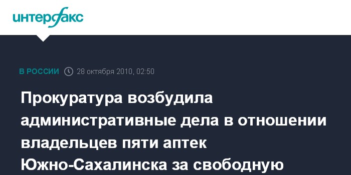 Южно-Сахалинск. 28 октября. ИНТЕРФАКС-ДАЛЬНИЙ ВОСТОК - Прокуратура Южно-Сахалинска выявила нарушения в пяти аптеках областного центра при реализации кодеиносодержащих препаратов, сообщили агентству "Интерфакс-Дальний Восток" в пресс-службе прокуратуры Сахалинской области в четверг.