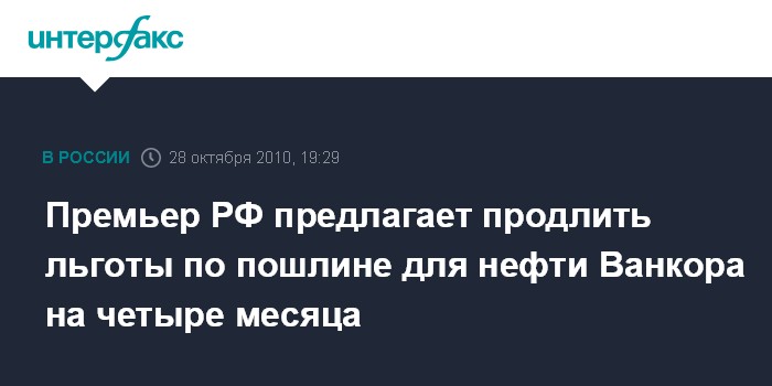 Самара. 28 октября. INTERFAX.RU - Премьер-министр РФ Владимир Путин предлагает продлить льготы по пошлине для нефти Ванкора на четыре месяца.