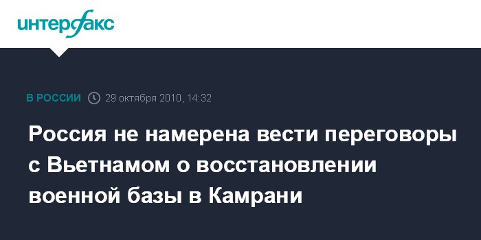 Москва. 29 октября. INTERFAX.RU - Россия не намерена вести переговоры с Вьетнамом о восстановлении ее военной базы в Камрани, заявил замглавы МИД РФ Алексей Бородавкин.