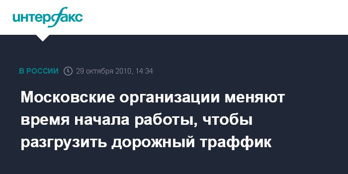 Москва. 29 октября. INTERFAX.RU - Городские организации Москвы перейдут на начало работы с 08:00, чтобы разгрузить дороги и уменьшить количество пробок, сообщил "Интерфаксу" источник в городской администрации.