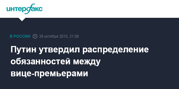Москва. 29 октября. INTERFAX.RU - Председатель правительства России Владимир Путин утвердил распределение обязанностей между своими заместителями, а также подписал распоряжение, вносящее изменения в состав ряда правительственных комиссий и рабочих групп.