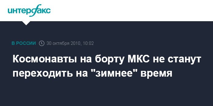 Москва. 30 октября. INTERFAX.RU - Экипажу Международной космической станции (МКС) не придется переводить стрелки часов на "зимнее" время так же, как и сотрудникам Центра управления полетами (ЦУП), потому что первые живут по времени Гринвича, а вторые - по декретному времени. "На МКС действует время по Гринвичу. Так в свое время договорились страны-партнеры. А в российском ЦУПе с момента его создания действует декретное время, которое совпадает с "зимним", но на час отстает от летнего", - сообщили "Интерфаксу-АВН" в Центре управления полетами. Разница между декретным временем ("зимним") и временем по Гринвичу составляет три часа.