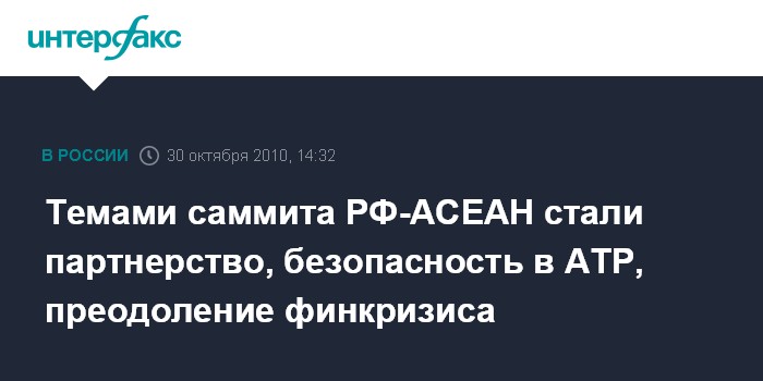 Москва. 30 октября. INTERFAX.RU - Участники саммита Россия-АСЕАН, состоявшегося в субботу в столице Вьетнама Ханое, обсудили состояние и перспективы российско-асеановского партнерства, рассмотрели пути построения в Азиатско-Тихоокеанском регионе более совершенной архитектуры безопасности и сотрудничества, сообщается на сайте Кремля. Значительное внимание было уделено обсуждению финансово-экономических аспектов совместных усилий в преодолении финансового кризиса, отмечается в сообщении.