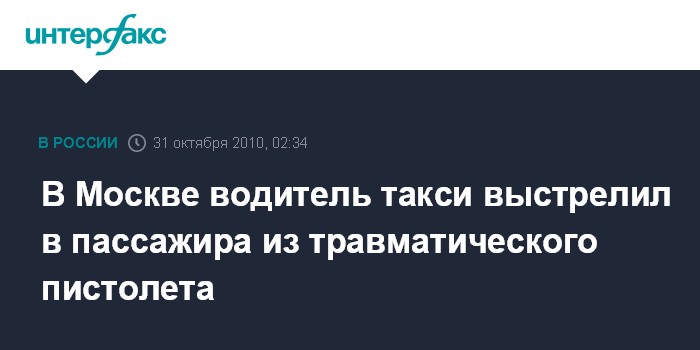 Москва. 31 октября. ИНТЕРФАКС - В Москве в районе дома 53 по улице Первая Останкинская таксист открыл огонь из травматического оружия по клиенту, который отказался платить за проезд.