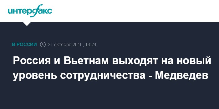 Ханой. 31 октября. INTERFAX.RU - Президент РФ Дмитрий Медведев подчеркнул важность постоянного диалога России и Вьетнама. В воскресенье в ходе встречи с премьер-министром Вьетнама Нгуен Тан Зунгом Д.Медведев отметил, что Россия и Вьетнам соблюдают последовательность в развитии двусторонних отношений. "Такая непрерывность контактов позволяет выходить на новый уровень сотрудничества", - сказал Д.Медведев. Президент РФ также рассчитывает, что Россия и Вьетнам будут расширять взаимодействие в различных сферах международной политики и экономики.