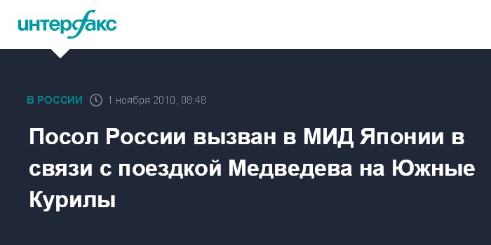 Токио. 1 ноября. INTERFAX.RU - Министерство иностранных дел Японии вызвало посла России в Токио Михаила Белого, чтобы вручить ему ноту протеста в связи с поездкой на Южные Курилы президента России Дмитрия Медведева, сообщает в понедельник агентство EFE.