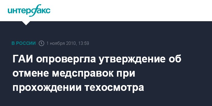 Москва. 1 ноября. INTERFAX.RU - Российская Госавтоинспекция опровергла утверждения некоторых СМИ о том, что при прохождении техосмотра больше не требуется заключение врачей о состоянии здоровья автовладельца.