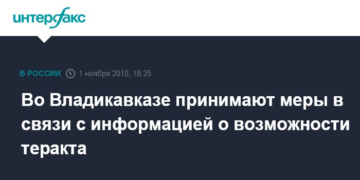 Владикавказ. 1 ноября. INTERFAX.RU - Жителей Владикавказа (Северная Осетия) просят проявлять повышенную бдительность в связи с возможной угрозой террористического акта.