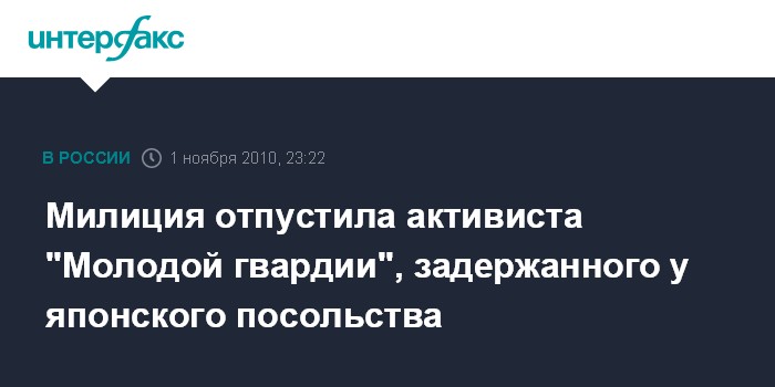 Ранее движение "Молодая гвардия Единой России" (МГЕР) сообщило о задержании А.Татаринова, который участвовал у посольства Японии в Москве в акции протеста против реакции Токио на визит президента России на Курилы.