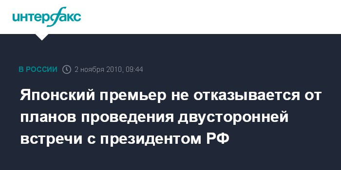 Лондон. 2 ноября. INTERFAX.RU - В Токио по-прежнему планируют провести в ноябре двустороннюю встречу между японским премьером Наото Каном и президентом России Дмитрием Медведевым, сообщает во вторник британская телерадиокорпорация BBC.