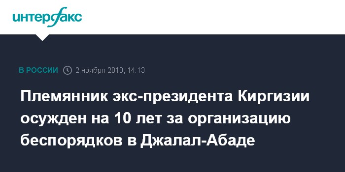 Бишкек. 2 ноября. INTERFAX.RU - Военный суд Киргизии приговорил к 10 годам лишения свободы племянника экс-президента Киргизии Санжара Бакиева за участие и организацию массовых беспорядков в мае текущего года в городе Джалал-Абад, передает корреспондент "Интерфакса".