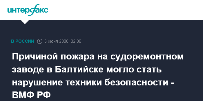 Москва. 6 июня. ИНТЕРФАКС - В командовании ВМФ РФ считают, что причиной пожара на 33-м судоремонтном заводе в Балтийске (Калининградская область), возможно, стало нарушение рабочими техники безопасности.