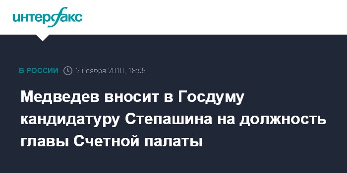 Москва. 2 ноября. INTERFAX.RU - Президент России Дмитрий Медведев внес на рассмотрение Государственной Думы кандидатуру Сергея Степашина для назначения на должность председателя Счетной палаты РФ, сообщила во вторник пресс-служба главы государства.