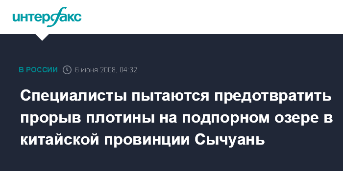 Пекин. 6 июня. ИНТЕРФАКС-КИТАЙ - В пятницу во второй половине дня ожидается начало стока воды из подпорного озера в горах Танцзяшань китайской провинции Сычуань, пострадавшей от землетрясения, заявил китайским СМИ руководитель группы экспертов, находящихся на озере.