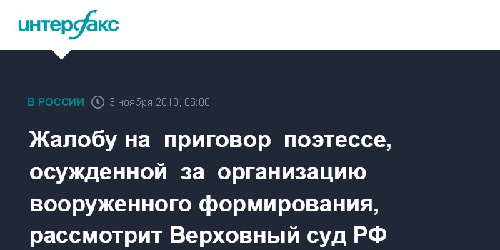 Жалобу на приговор поэтессе, осужденной за организацию вооруженного формирования, рассмотрит Верховный суд РФ