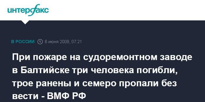 При пожаре на судоремонтном заводе в Балтийске три человека погибли, трое ранены и семеро пропали без вести - ВМФ РФ