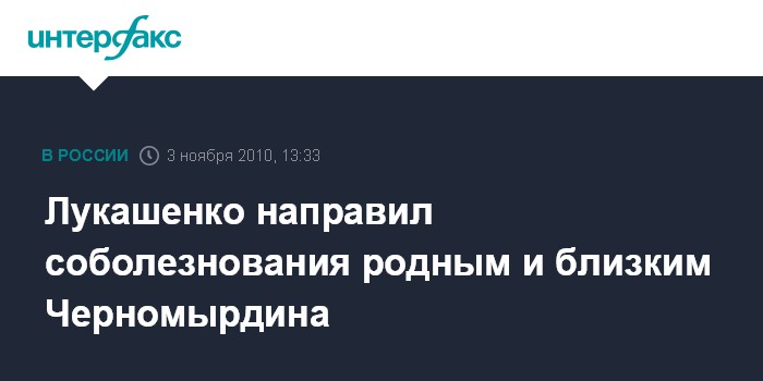 Минск. 3 ноября. INTERFAX.RU - Президент Белоруссии Александр Лукашенко от имени белорусского народа и себя лично выразил соболезнования родным и близким Виктора Черномырдина, сообщили агентству "Интерфакс" в среду в пресс-службе главы государства.