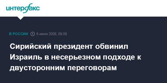 Москва. 6 июня. INTERFAX.RU - Президент Сирии Башар Асад заявил, что если Израиль будет настаивать на том, чтобы вести возобновленные между двумя странами переговоры о мире "с нуля", это покажет несерьезность намерений Тель-Авива достичь мира.