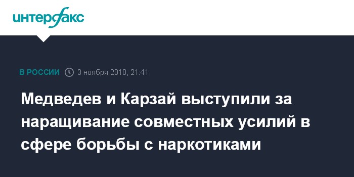 Говоря о совместной борьбе с вызовами и угрозами, Медведев и Карзай особо отметили недавно проведенную антинаркотическую операцию, в результате которой было уничтожено большое количество наркотиков и оборудования для их производства. Особо было отмечено, что в рамках этой операции впервые было отработано взаимодействие антинаркотических служб Афганистана, США и России.