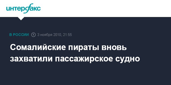 Брюссель. 3 ноября. INTERFAX.RU - Судно с 29 пассажирами, направлявшееся с Коморских островов в Танзанию, захвачено сомалийскими пиратами, сообщает в среду Европейская миссия по противодействию пиратству у берегов Сомали.