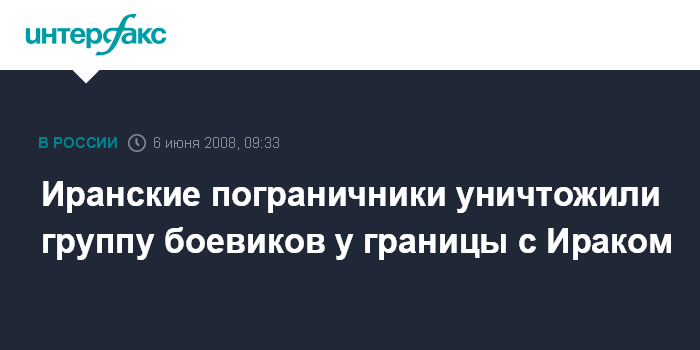 Москва. 6 июня. INTERFAX.RU - У границы с Ираком иранские пограничники вступили в бой с вооруженной группой и уничтожила 12 боевиков. По словам иранского агентства ФАРС, вооруженная группа планировала "террористическую деятельность" в Исламской Республике. Сообщается также, что с иранской стороны погибли четыре пограничника.