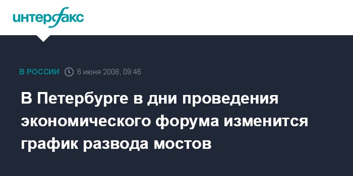 Москва. 6 июня. INTERFAX.RU - В дни проведения XII Петербургского международного экономического форума график разводки мостов будет изменен. Об этом сообщает пресс-служба комитета по благоустройству и дорожному хозяйству Петербурга.