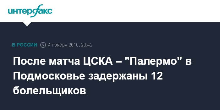 Химки. 4 ноября. ИНТЕРФАКС - По итогам футбольного матча между командами ЦСКА (Москва) - "Палермо" (Италия) в подмосковных Химках задержаны 12 человек, сообщает ГУВД Московской области в четверг.