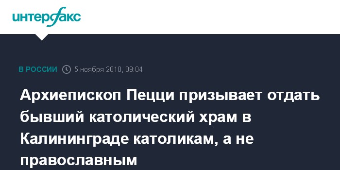 Москва. 5 ноября. ИНТЕРФАКС - Глава католической архиепархии Божьей Матери в Москве архиепископ Паоло Пецци призвал пересмотреть решение калининградских властей о передаче бывшего католического храма Святого Семейства Русской православной церкви и вместо этого вернуть его католической общине.