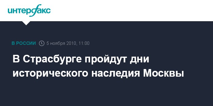 Москва. 5 ноября. INTERFAX.RU - Дни исторического и культурного наследия Москвы пройдут с 6 по 20 ноября в Страсбурге, сообщили "Интерфаксу" в горадминистрации. Соответствующее распоряжение правительства Москвы подписал градоначальник Сергей Собянин. "Дни исторического и культурного наследия станут значимым событиям в рамках Года России во Франции и Года Франции в России в 2010 году", - отметил он. В рамках этих Дней пройдет выставка, посвященная историко-культурному наследию российской столицы, а также международный семинар по вопросам охраны памятников истории и культуры.