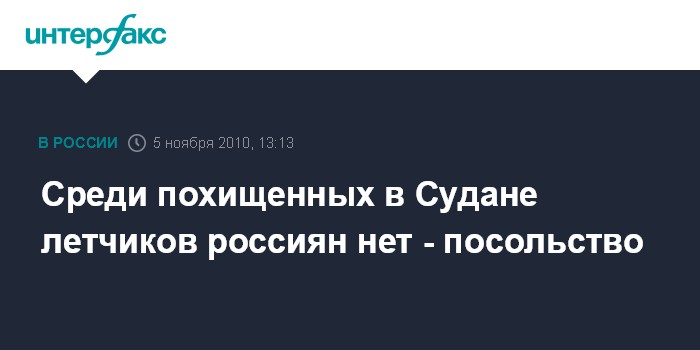 Москва. 5 ноября. INTERFAX.RU - В посольстве России в Судане опровергают информацию о захвате россиян. "В городе Нияла штат Южный Дарфур, неизвестные вооруженные лица похитили троих пилотов Латвийской авиакомпании "JM Helicopters", которая работает в Судане по контракту Всемирной продовольственной программы", - сообщил в пятницу "Интерфаксу" по телефону заведующий консульским отделом посольства России в Судане Евгений Аржанцев. Он отметил, что "по информации, полученной посольством от официального представителя Всемирной продовольственной программы в Хартуме, российских граждан среди похищенных пилотов нет".