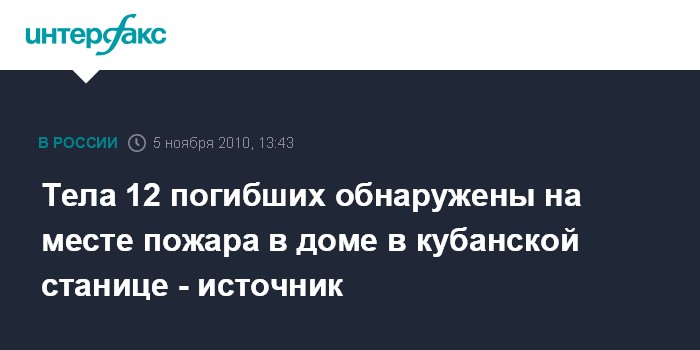 Ростов-на-Дону. 5 ноября. INTERFAX.RU - Тела 12 погибших обнаружены в сгоревшем частном доме в станице Кущевская (Краснодарский край), сообщил в пятницу агентству "Интерфакс-Юг" источник в правоохранительных органах Кущевского района Краснодарского края. "После локализации пожара в частном доме в станице Кущевская, в котором проживал фермер и его семья, обнаружены тела 12 погибших", - сказал собеседник агентства. Он уточнил, что среди погибших - трое детей.