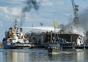На судоремонтном заводе в Балтийске сгорел контейнеровоз "Енисей", на котором произошел взрыв во время ремонтных работ. Погибли трое рабочих, до десяти числятся пропавшими без вести