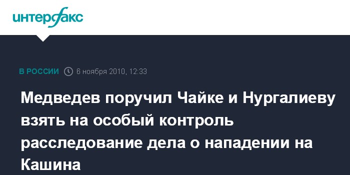 Москва. 6 ноября. INTERFAX.RU - Президент РФ Дмитрий Медведев поручил генпрокурору России Юрию Чайке и министру внутренних дел Рашиду Нургалиеву взять на особый контроль расследование уголовного дела о нападении на журналиста "Коммерсанта" Олега Кашина, сообщили в субботу в пресс-службе Кремля. Глава государства поручил принять необходимые меры для раскрытия данного преступления, сказали в пресс-службе.