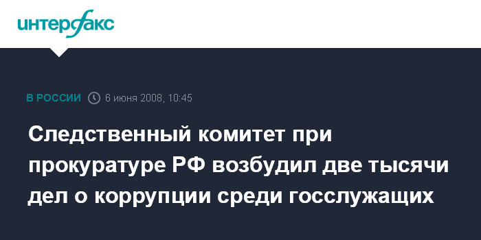 Москва. 6 июня. INTERFAX.RU – РФ возбуждено почти 450 уголовных дел о коррупции среди госчиновников и более 1600 - в отношении сотрудников правоохранительных органов.