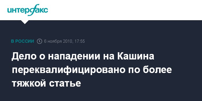 Москва. 6 ноября. INTERFAX.RU - Уголовное дело о нападении на журналиста газеты "Коммерсант" Олега Кашина переквалифицировано по статье "Покушение на убийство группой лиц", сообщил официальный представитель СКП РФ Владимир Маркин в субботу "Интерфаксу". По его словам, такое решение принято следователем в связи с тем, что в покушении на О.Кашина участвовали двое преступников.