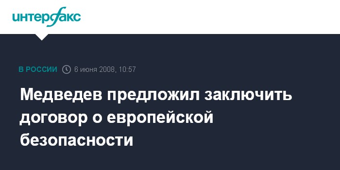 Москва. 6 июня. INTERFAX.RU – Президент РФ Дмитрий Медведев предложил созвать общеевропейский саммит для запуска разработки нового договора о европейской безопасности.