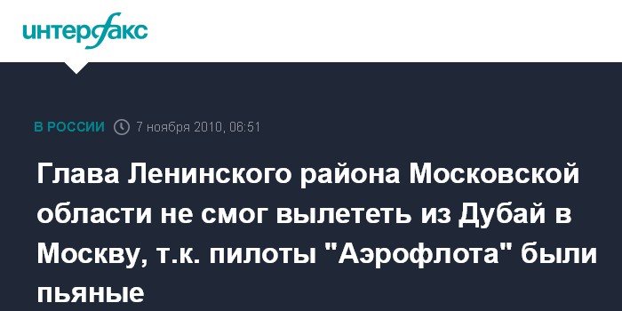 Москва. 7 ноября. ИНТЕРФАКС - Глава Ленинского района Московской области Сергей Кошман не смог вылететь из Дубай в Москву регулярным рейсом "Аэрофлота" (СУ 520). По утверждению источника в окружении главы района, оба пилота находились в состоянии алкогольного опьянения.