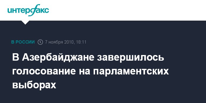 Баку. 7 ноября. INTERFAX.RU - Завершилось голосование на парламентских выборах в Азербайджане. Избирательные участки, открытые с 8.00 утра, закрылись в 19.00 по Бакинскому времени. После этого начинается подсчет голосов, первичные данные с избиручастков ожидаются через два часа. На парламентских выборах по состоянию на 17.00 местного времени проголосовали 44,75% избирателей.