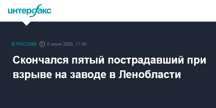 Москва. 6 июня. INTERFAX.RU – В реанимации Военно-медицинской академии умер последний госпитализированный после взрыва на заводе "Киришинефтеоргсинтез" в Ленинградской области.
