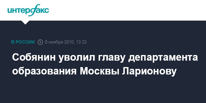 Как стало известно "Интерфаксу", в понедельник столичный градоначальник освободил от занимаемой должности руководителя департамента образования Ольгу Ларионову. Вместо нее, по данным "Интерфакса", скорее всего, будет назначен замминистра Минобрнауки РФ Исак Калина. Официальным подтверждением данной информации "Интерфакс" пока не располагает.