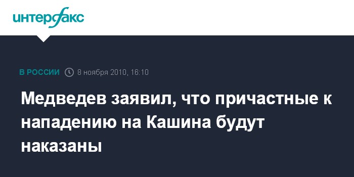 Москва. 8 ноября. INTERFAX.RU – Президент России Дмитрий Медведев уверен, что причастные к нападению на журналиста Олега Кашина, будут изобличены и наказаны.