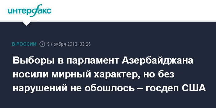 Вашингтон. 9 ноября. ИНТЕРФАКС - Госдепартамент США отмечает мирный характер состоявшихся 7 ноября парламентских выборов в Азербайджане, однако считает, что они не соответствовали международным стандартам, говорится в заявлении пресс-секретаря американского дипведомства Филипа Кроули.