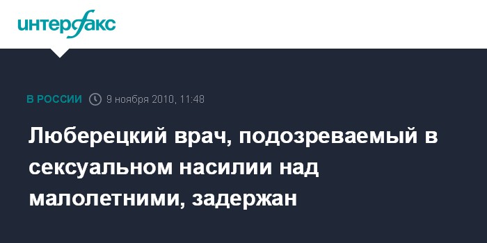 Москва. 9 ноября. INTERFAX.RU - Врач-травматолог Люберецкой детской больницы, подозреваемый в совершении насильственных преступлений в отношении малолетних детей, задержан, сообщил официальный представитель СКП РФ Владимир Маркин.