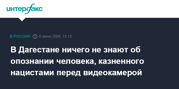 Москва. 6 июня. INTERFAX.RU - Следственные органы Дагестана не располагают сведениями об опознании жителя республики, видеозапись казни которого была размещена в Интернете, сообщил "Интерфаксу" руководитель Кизилюртовского межрайонного следственного отдела Следственного управления СКП по Дагестану Вадим Дергачев.